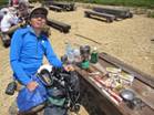 16、太郎平小屋前の広場で昼食 フリーズドライの味噌汁、ソーセージ、挟間師匠が差し入れしてくれた山菜おこわ。そして登頂を祝してブランデーで乾杯。