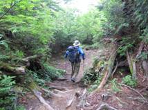 岩がゴロゴロした涸れ沢の急坂 5時59分 薬師峠を過ぎるとここから本格的な上りとなる。たぶんここは雨が降ると川のようになるのだろうと・・・。ところどころで水が流れている。