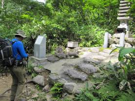 愛知大学生の慰霊碑 5時26分 登山口からすぐのところに愛知大生の遭難を供養する十三重の塔があった。 この塔は、昭和38年1月に愛知大学山岳部の13人が、豪雪のため遭難した慰霊碑です。 慰霊碑に手を合わせ、気を引き締め進む。 |