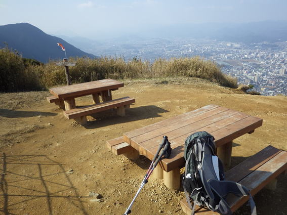 5、足立山山頂 11時19分 598m ここが小倉を代表する山、足立山山頂である。 登山口から2時間35分で山頂に到着!この足立山は別名「霧ヶ岳」とも呼ばれている。 5年前門司港駅から風師山〜矢筈山〜戸の上山〜足立山〜妙見山〜小文字山と9時間かけて縦走したことを思い出した。 山頂碑の後ろには、霞んでいるが貫山が確認できた。 |