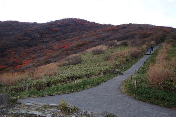 学生グループが楽しそうに歩いていく 12時47分 左奥のピークが星生山 |