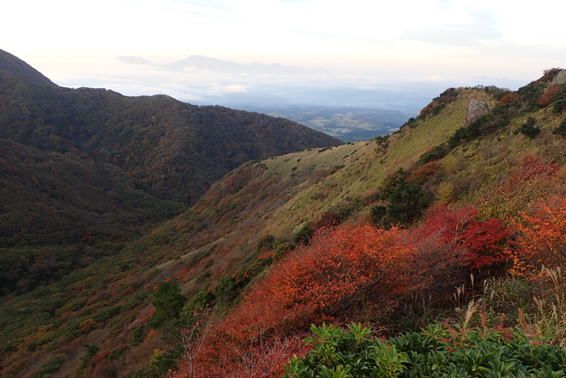 牧ノ戸方面の紅葉 14時38分 右端は涌蓋山