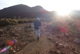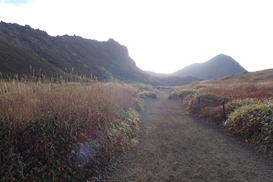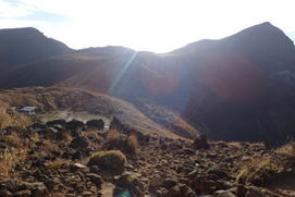 3、西千里ヶ浜 7時44分 逆光の中、星生山への斜面を上る登山者を横目に、西千里ヶ浜を歩く。 星生山 |
