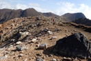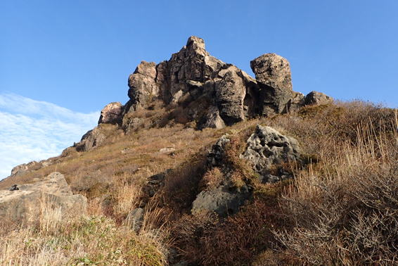 | 眼前に星生山の山頂 13時10分 若者が少し待機して岩場のルートを探っている 先行の登山者は岩場に苦戦しているようで、なかなか前に進まない |