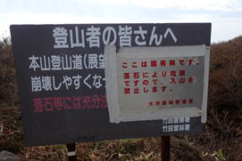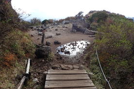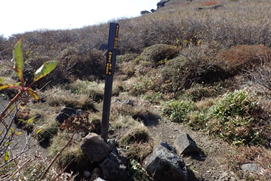 分岐で小休憩 10時49分 この分岐は、今歩いてきた道を含めて4つのルートに分かれている。 1、中岳 2、久住山 しかし、坊ヶツルへの道は以前から土石流の為、通行止めとなっている。(18年前は家族で法華院温泉山荘まで下ったことがある) |