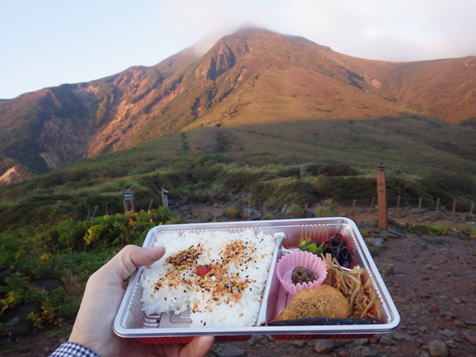 | 慰霊碑の丘で法華院温泉山荘のお弁当(二つ目)を頂く 11時07分 最高に旨い! |