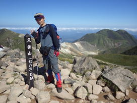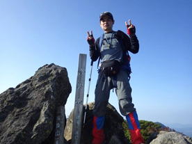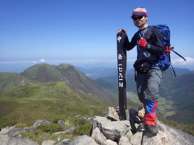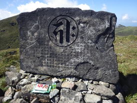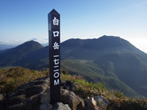 32、中岳 11時52分 1791m 九州本土最高峰の中岳に登頂!最高の気分に浸る。背景の三俣山には雲一つ無く、昨日の霧がまるでウソのようだ! 15座目 |
