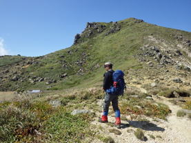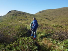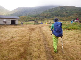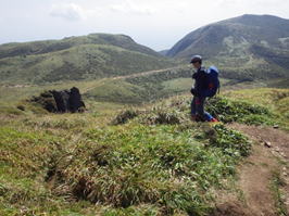 37、西千里ヶ浜 13時42分 星生山山頂から一気に下って来た。これから肥前ヶ城の登山道入り口を探すことになるが、西千里ヶ浜には白いロープが張られて肥前ヶ城方面に入りづらくなっている。「立入り禁止」なのか?はっきりしない。それで、少し戻ることになるが、西千里ヶ浜を久住山方面に歩きながら様子を伺った。ロープは続き星生崎手前までウロウロと歩いて行った。 |