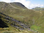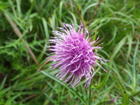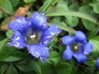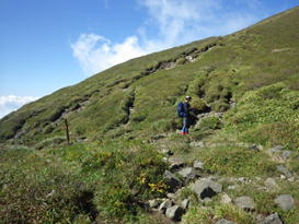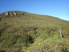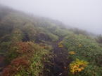 13、大戸越(うとんごし) 13時52分 南峰から16分で大戸越まで下って来た。腰を下ろして休憩。6月にはピンクに染まる平治岳南峰斜面。今は霧が晴れて良く見える。 リンドウ |