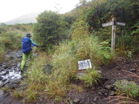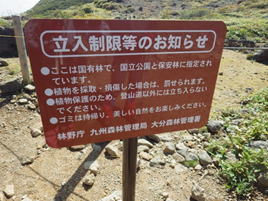 扇ヶ鼻への登山道にて 14時20分 立入規制のお知らせ(看板より) ●ここは国有林で、国立公園や保安林に指定されています。●ミヤマキリシマなどの植物保護のため、ロープ柵から外には立ち入らないようにしてください。●ロープ柵の中を歩くときも、植物を傷つけないよう十分注意してください。●皆様のご理解とご協力を。 林野庁 九州森林管理局 大分森林管理者 |