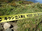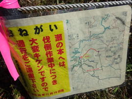おねがいの貼り紙 14時07分 扇ヶ鼻分岐からも登山道の両サイドに白いロープが張られ、なんとなく嫌な予感がした。ミヤマキリシマ等の植物保護だった。 瀬の本へは、伐倒作業中につき大変キケンですので、通行をご遠慮ください。(貼紙より) ロープにぶら下がっている貼り紙を読んでみたが、地図をよく見ると岩井川岳までは通行できるので、安心して進んだ。 |