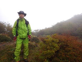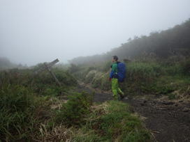 すがもり越えの休憩舎のベンチに座り、作戦会議! 「チャレンジ21」も1座目で断念なのか? 少しためらう気持ちも出たが安全第一を忘れず、「とにかく行けるところまで行ってみよう!」と気を取り直して、レインウェア、ザックカバー等の完全装備で三俣山を目指すことにした。スマホによる天気予報は午後から回復するらしいが、そのようには思えない。霧雨は完全に雨に変わり、霧は更に濃く、そして風も吹いてきた。 「さあ、三俣山に登ろう!」(本音はかなり不安) 無理はしないことを肝に銘じて、右側のなだらかなスロープの登山道を進むことにした。