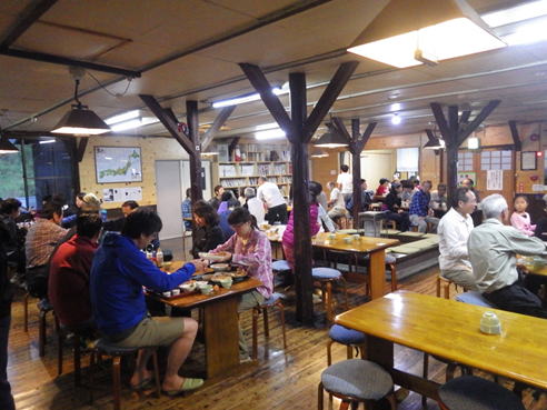 満席の夕食風景 18時05分 各テーブルで「乾杯!お疲れ様!」と言う声が飛び交う