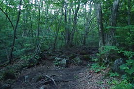 森は続く 5時41分 土石流跡地で一瞬視界が開けるが、また森に突入する |