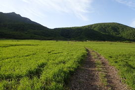 坊ヶツルは、4月上旬に野焼きが行われて大地は真っ黒に焦げたが、今はもう一面グリーン。 |