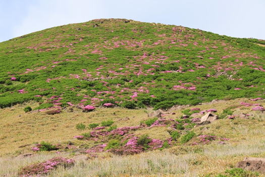 急登を登り切って大船山を望む 10時39分 鮮やかなピンクがグリーンに映える |
