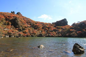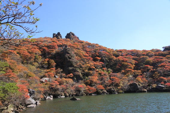 風があるのか、さざ波が立って、水面に紅葉が映る風景は撮影できなかった。
