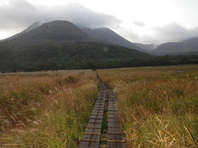 タデ原湿原 6時12分 うす雲が三俣山に・・・。少々不安を感じながらも、濡れてツルツルと滑る木道を進む。 |