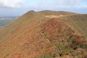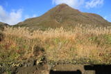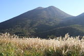 坊ヶツルが見えてきた 8時00分 一面がススキに覆われる。左に目をやると6月に山頂一帯がピンクに染まる平治岳が見える。 |