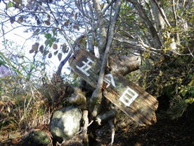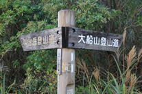 大船山への分岐表示 8時47分 登山口から赤テープを確認しながら30分程歩くと黄色い文字の「大船山」の表示が目についた。 |