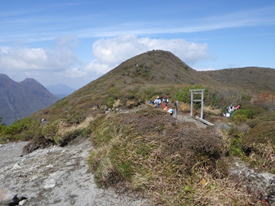 大船山が見えた! 9時21分 目指す大船山頂が見えてきたが、この斜面の細い登山道で渋滞に・・・。団体さんが・・・。 |