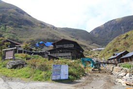 12、法華院温泉山荘 12時35分 標高1303m。ここの温泉は九州で一番高所に湧き出る温泉として有名である。 |