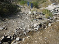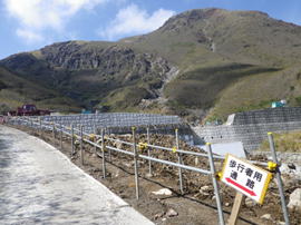 治山工事跡を通過 14時51分 ちょっと前まではこの鉱山道路は落石で道が塞がれていたが、治山工事が完了してとても歩き易くなっていた。ありがたい。 |