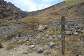 スガモリ峠 14時29分 三俣山西峰から15分かかってスガモリ峠に下ってきた。水分補給をしてガレ場に向かう。 さあ下山 |