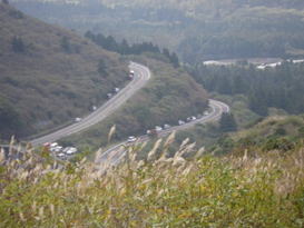 大曲が見えてきた 14時59分 大曲への分岐まで歩いてきた。駐車場から溢れた車がたくさん路肩に駐車している。しかし私はまっすぐ長者原まで鉱山道を下る。 |