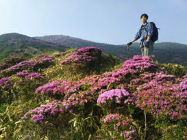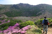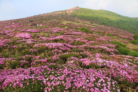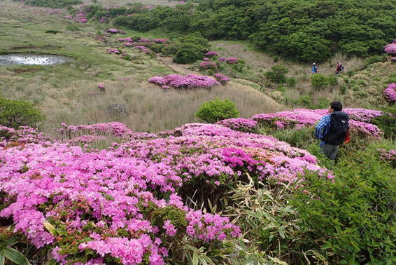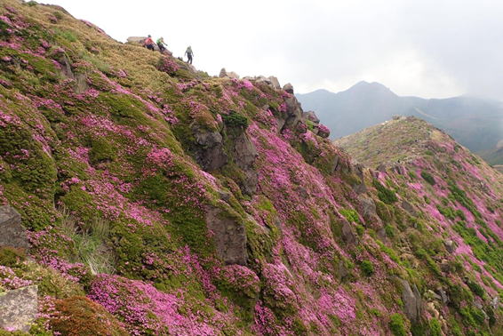 ピンクの絨毯 7時27分 ミヤマキリシマの群落の中を登山者が上っている |