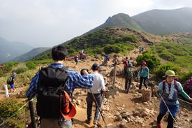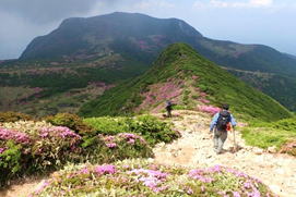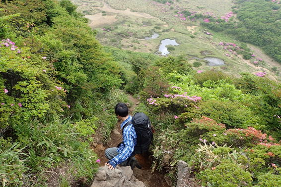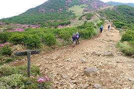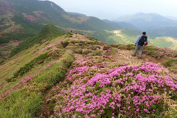 ミヤマキリシマも終盤を迎え、今年もまた最盛期に縁がなかったことに、悶々とした気持ちで過ごしていた。しかしながら場所によってはまだ十分咲いている。「まだ間に合う。ヨシッ、行くぞ!」と当初単独で、平治岳〜大船山の縦走を考えていた。ところが息子が父の日だから一緒に歩こうと言ってくれたので、急遽コースを変更して扇ヶ鼻と星生山のコースに変更した。 |