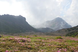 星生山の稜線に咲くミヤマキリシマ 9時14分 背景に聳えるのは久住山 |