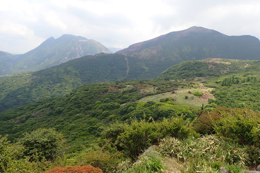 沓掛山の展望場所からの風景 11時17分 三俣山(左)と星生山(右) |