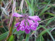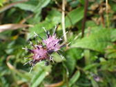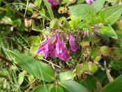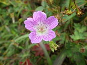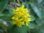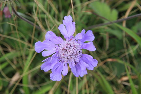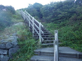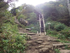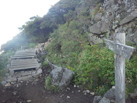木段に変わる 6時41分 稜線に出る手前でコンクリート道から木段に変わる。牧ノ戸登山口からこの辺りまで上ってくると、大抵の人は(私だけかも知れないが・・)息が上がってしまう。木段になると気分が変わりホッとする瞬間だ!これからの長丁場を考えると登山口からここまではゆっくり歩くことがポイントだろう。木段の両サイドに小さな花がチラホラと顔を出している。どれどれ・・。 |