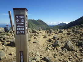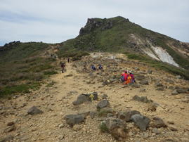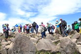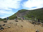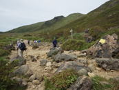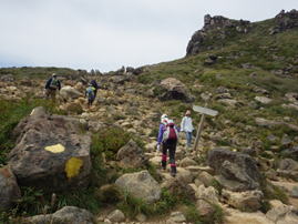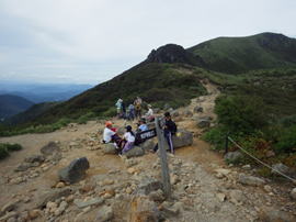 久住山を上る 11時40分 大勢の登山者が山頂を目指していた。やはり九重連山の盟主「久住山」だけある。 小さな子供を連れたファミリーや若者グループが目に付いた。私の様な年配単独行は静かに列の端っこを歩いている。日頃は静かな登山が多いだけに、このような賑やかな山に遭遇すると、ちょっと戸惑ってしまう。久住山だから仕方ないのだが・・。 |