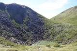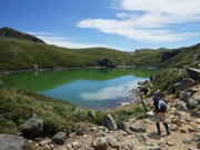 | 天狗ヶ城からエメラルドグリーンの御池(みいけ)を見下ろす 10時57分 右は久住山。御池の上部の稜線に先程参拝した慰霊碑が確認できた。 |