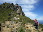 慰霊碑の前でのんびり休憩する山レディ 二人 10時10分 左は天狗ヶ城、右は中岳 |
