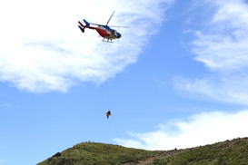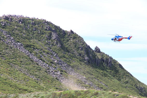 ヘリコプターによるレスキュー 11時14分 久住山の山頂から多くの人が見守っている |