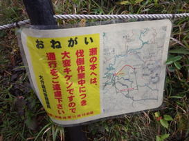 おねがいの貼り紙 13時08分 扇ヶ鼻分岐に1枚の貼り紙があった。読んでみると、 11月10日迄、扇ヶ鼻から「瀬の本」に下るルートは伐倒作業中につき、大変キケンですので通行をご遠慮下さい。」と書いてある。地図を見ると、岩井川岳(いわいごだけ)までは行けるらしい。私は岩井川岳の山頂は踏んだことがないので一度は行ってみたいと思っている。 |