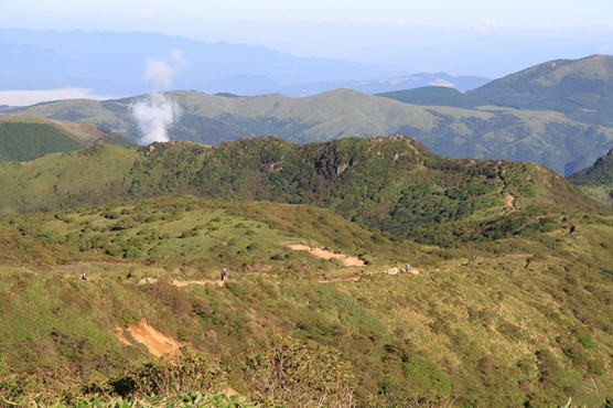 左の白い山肌は硫黄山、正面は三俣山、右奥はミヤマキリシマで有名な平治岳。