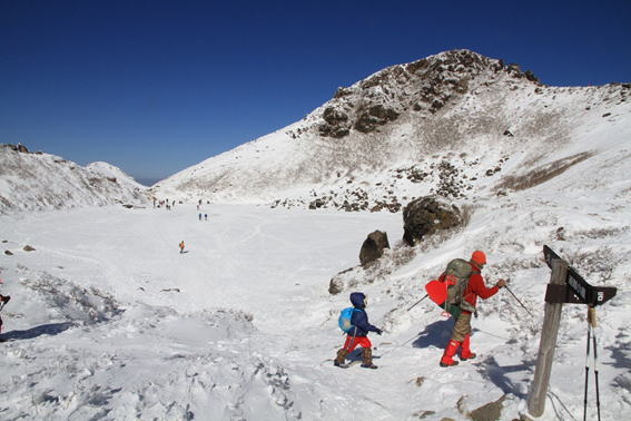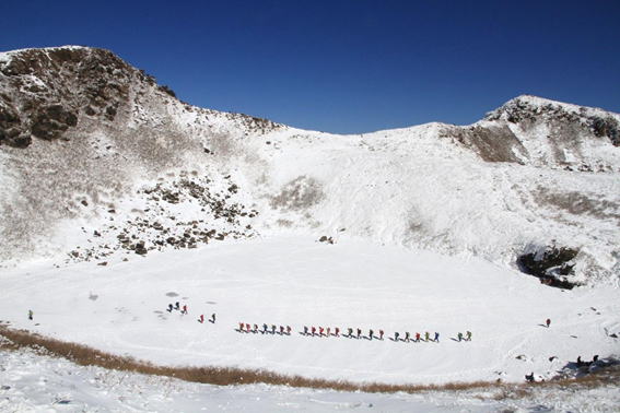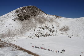 氷結した御池(みいけ) 団体さんが一列になって御池の湖面を歩いている