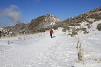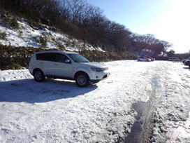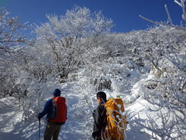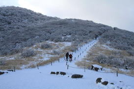 早朝7時30分に牧ノ戸駐車場に到着した。気温は−8℃、さすがに冷え込んでいる。沓掛山を見てみると、山腹にはどんより雲がかかっている。「こんなはずじゃなかったのに」と、また山のお天気に悩まされる。しかし、雲が現れたのはこの時だけで、その後雲は流れて終日快晴、文句なしの冬山登山を楽しむことが出来た。ただ、稜線上はかなりの強風だった。 |