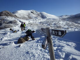 | 星生山の稜線に出ると強風が吹き荒れ、思わず身構えた。そんな中、手袋を拾った。きっと先行する青年の持物だろうと、急いで山頂へ。彼らは休憩を終え、出発準備の最中だった。聞いてみると、やっぱりそうだった。二重の手袋だったので気づかなかったみたいだ。よかった! |