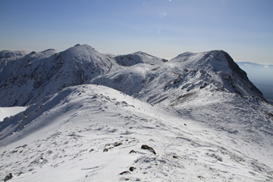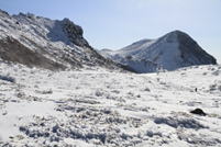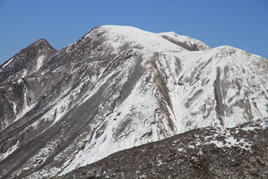 ![]() 坊ヶツル方面は雪が少ない。 山肌も白くなく、雪の降り方が違うのだろう。 |