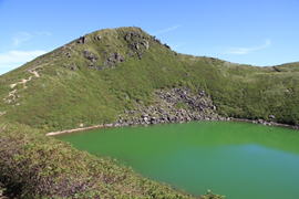 慰霊碑から稜線を辿り、御池湖畔へ降りて行く。その途中で御池を真下に見下ろせる場所がある。覗き込むと蟻の行列のように団体登山者が湖面を歩いていた。 |
