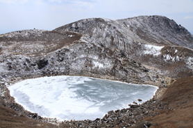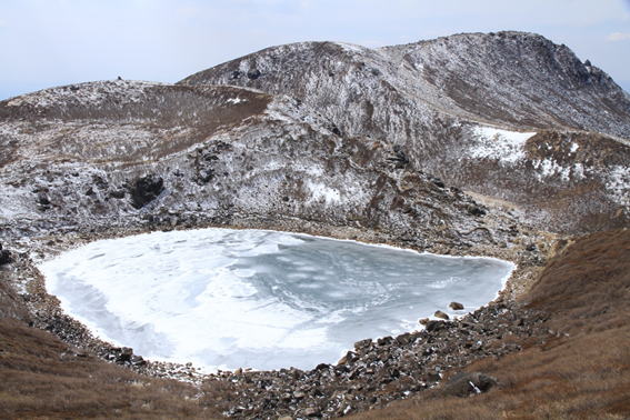 | 天狗ヶ城山頂から凍った御池を見下ろす。右奥は久住山。 |