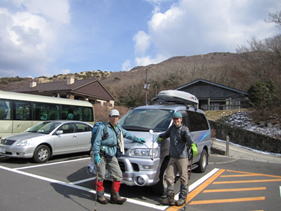 牧ノ戸駐車場 7時13分 出発前に元気な姿で記念撮影。 |