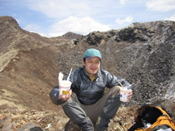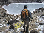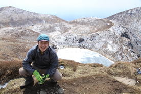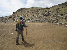 御池の畔を歩いて中岳へ 10時37分 怖々、池に近づいてみる。 危険だ!