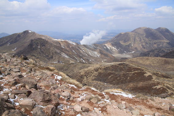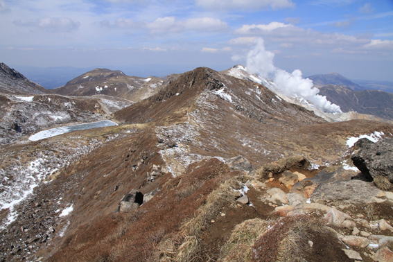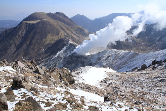 三俣山(左) ・ 噴煙を上げる硫黄山(中央) ・ 噴煙の奥左は平治岳、奥右は大船山