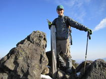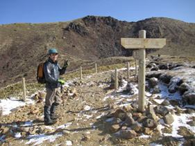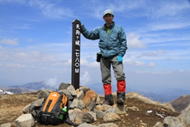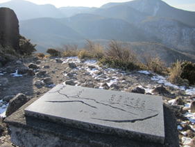 11、中岳山頂 10時56分 1791m ここは九重連峰の中心である。 バックには大船山がくっきりと見える。山頂から偶然、阿蘇の野焼きも見ることができた。 ここで、思いもかけず山口県からのベテラン登山者から饅頭(まんじゅう)を頂戴した。 |